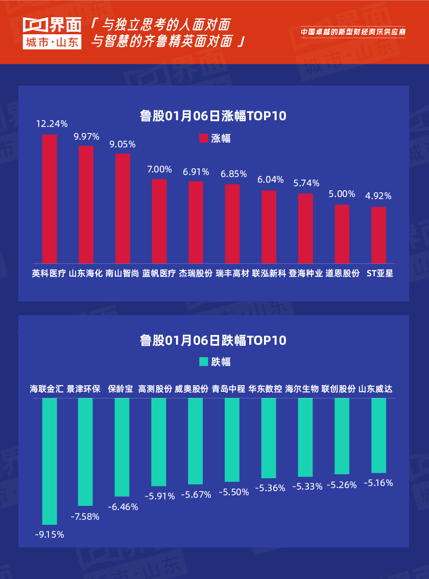 1月6日,山东省内沪深股票有65只个股上涨,162只个股下跌;总市值过千亿的有万华化学(600309)、海尔智家(600690)、潍柴动力(000338)、青岛啤酒(600600)、歌尔股份(002241)、中泰证券(600918)、中航沈飞(600760)、山东黄金(600547)共8家,500亿-1000亿的共有4家,分别是华熙生物(688363)、华鲁恒升(600426)、英科医疗(300677)、睿创微纳(688002)、玲珑轮胎(601966)、光威复材(300699)。