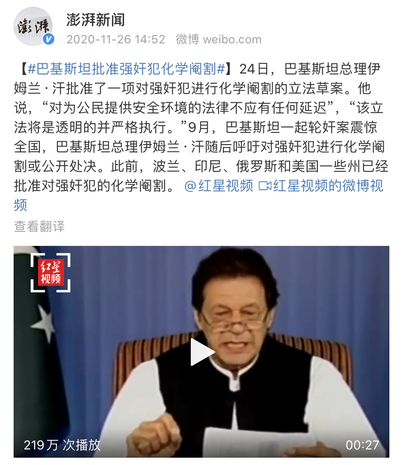 轮奸案引起全国关注后,2020年11月24日,巴基斯坦总理批准了一项对强奸犯进行化学阉割的立法草案。