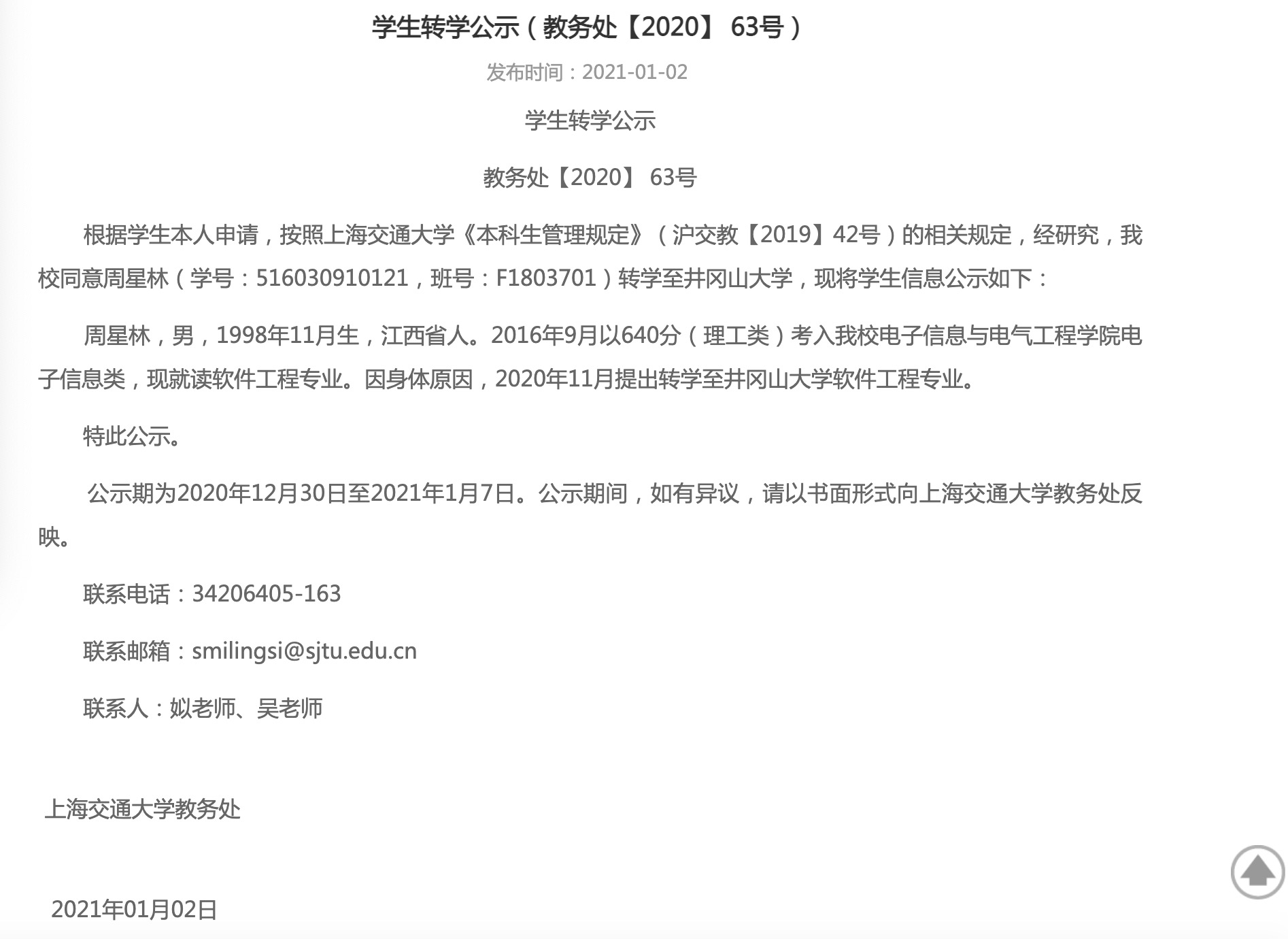 上海交通大学在公示中提到,周星林现就读上海交通大学软件工程专业,因身体原因,2020年11月提出转学至井冈山大学软件工程专业。公示期为2020年12月30日至2021年1月7日。