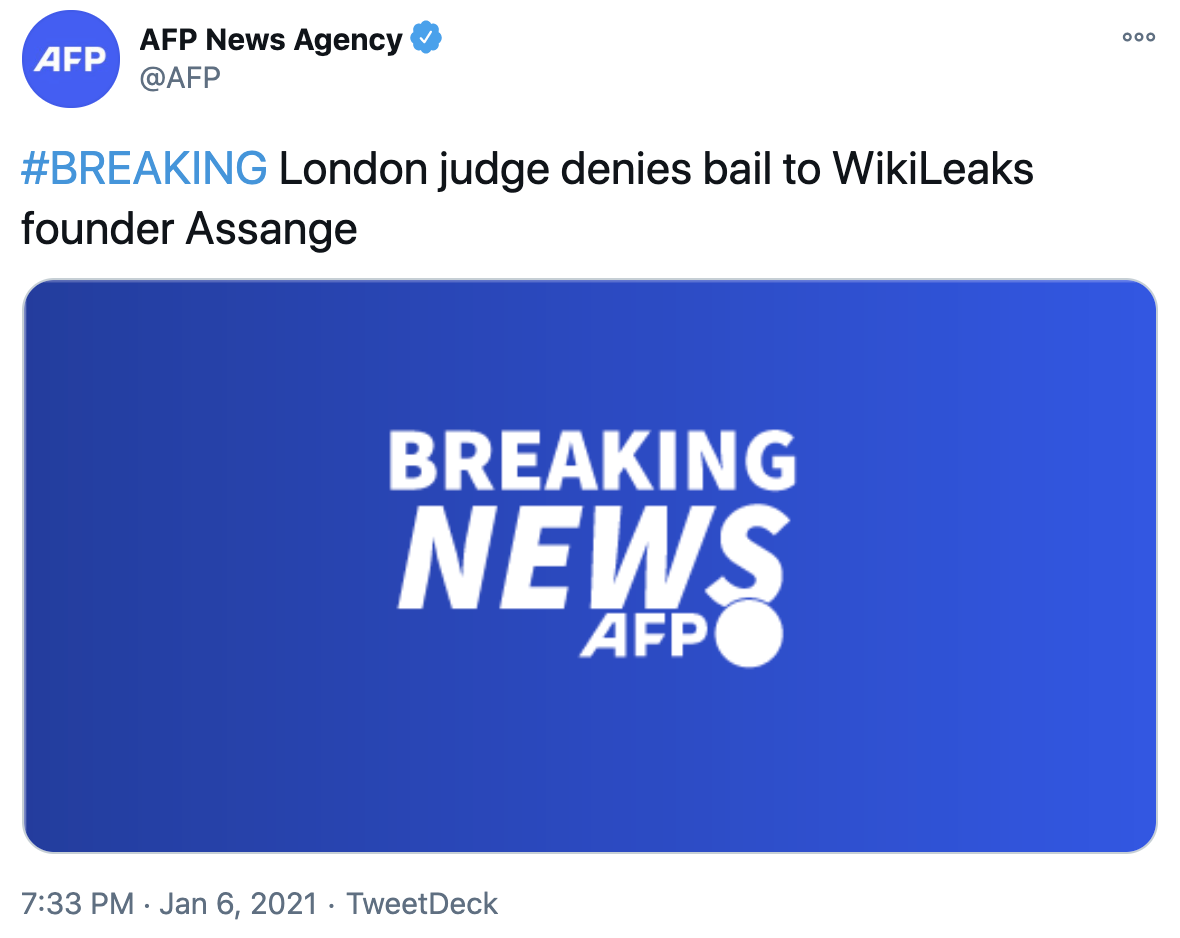法新社1月6日消息,伦敦法官不允许保释“维基揭秘”网站创始人朱利安·阿桑奇。