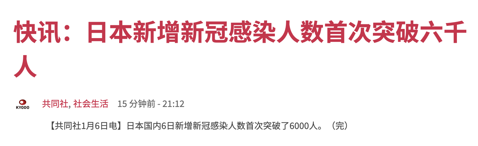 共同社1月6日消息,日本国内6日新增新冠感染人数首次突破了6000人。
