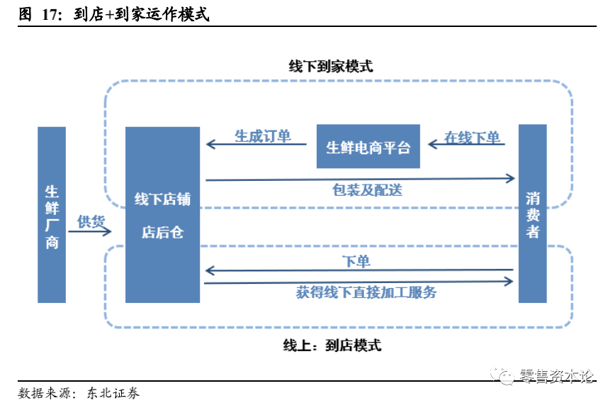 到店消费+线上购物即时配送,提供线上线下一体化消费体验。“到家”+“到店”模式也是仓店一体化模式,包括线上巨头向线下扩展和线下商超开通到家业务两种类型,前者以盒马鲜生、 7Fresh 为代表,后者以永辉超市、家家悦为代表。