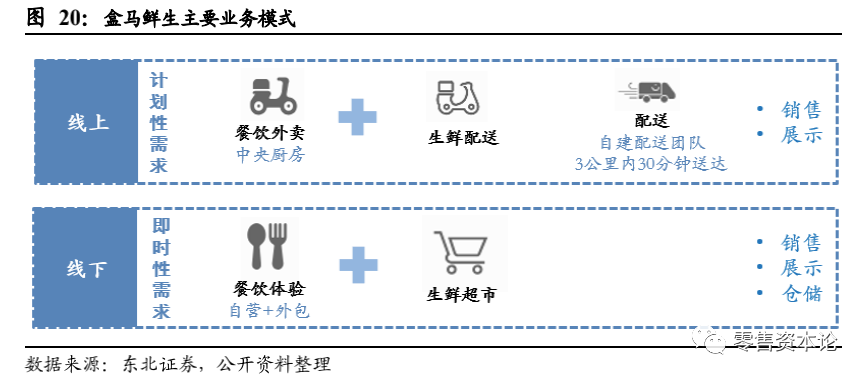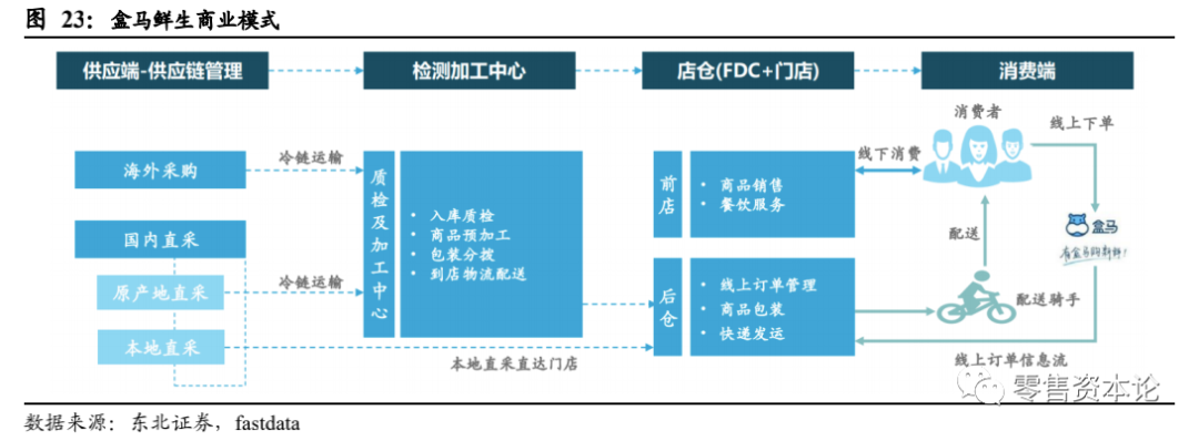 3)物流仓储建设:今年9 月的阿里巴巴投资者大会上,盒马披露已建成48 个多温层多功能仓库,包括33 个常温和低温仓、11 个加工中心和4 个海鲜水产暂养中心,并且和菜鸟展开合作,搭建了从产地-仓库→口岸-仓库→仓间调拨→大仓-店仓→门店-消费者的完整的物流体系。
