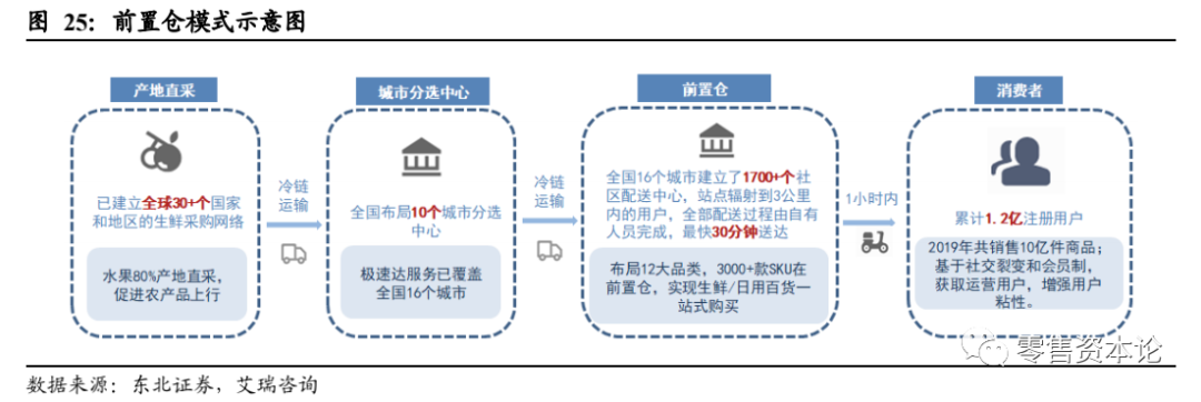 “城市分选中心+社区前置仓”模式已在全国 16 个主要城市建立起极速达冷链物流体系,为会员提供最快30分钟达服务,并实现大规模分布式仓储体系的数据化管理。