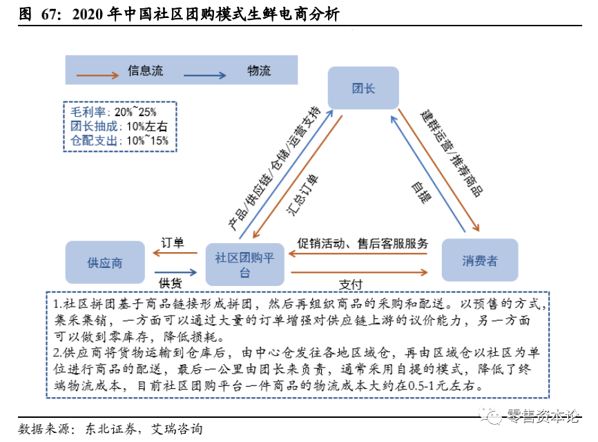 1)社区拼团模式由团长在微信群里推广团购产品,利用熟人关系链获客成本得以降低。