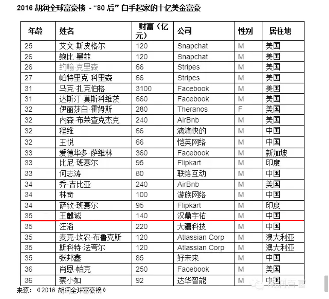 2月24日,胡润研究院在北京发布《2016胡润全球富豪榜》,在全球经济放缓的大背景下,十亿美金富豪仍增加99人至2188位,大中华地区以568位十亿美金富豪人数首次超越535位的美国,23位全球“80后”白手起家上榜富豪中,8位来自中国,其中80后创业代表王麒诚先生以140亿元的财富继续霸榜。