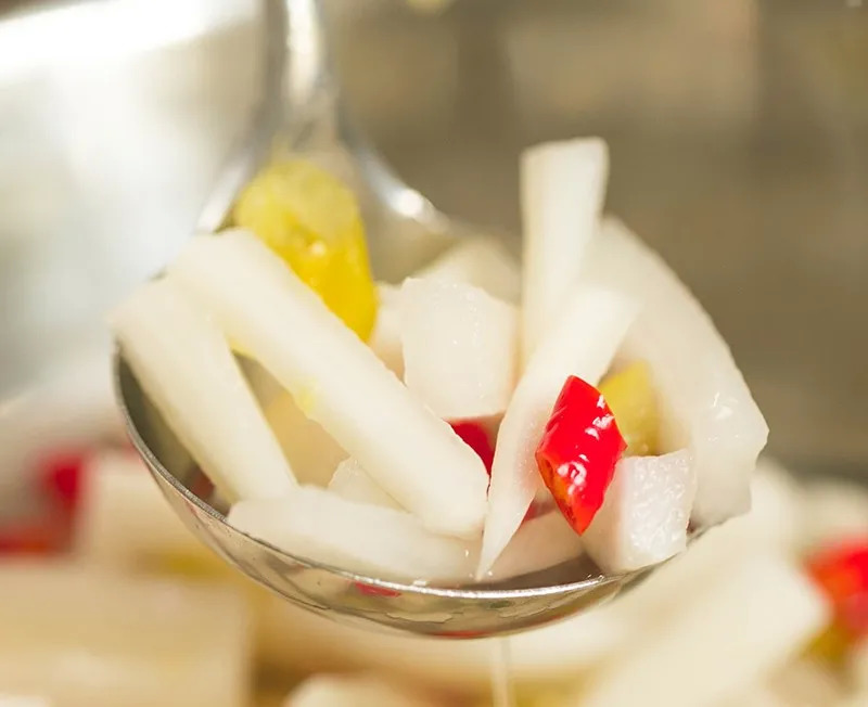日本称泡菜为“渍物”,起源说法不一,有人认为是唐时期鉴真和尚东渡日本宣传佛法,顺便带上了我们的泡渍菜以示友好;也有人认为是古时由韩国传入日本,后根据本国国情加以改进,形成独树一帜的风格。最近几十年,日本泡菜受到西方文化影响,从口味到制作皆逐渐与中国和韩国拉开了差距,多选用天然色素、酱油和白酒泡渍,倡导“低盐、增酸、低糖”的非发酵型健康泡菜。