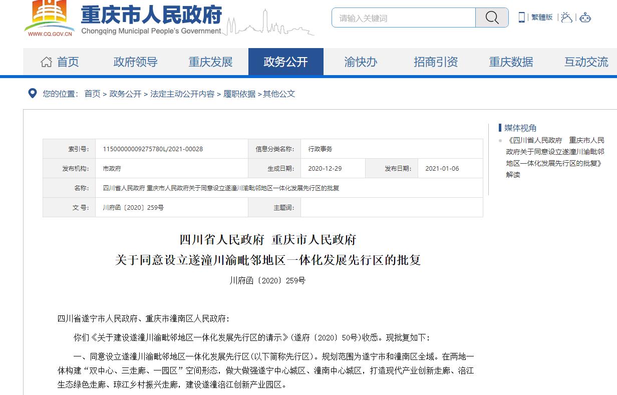 1月6日,重庆市人民政府网发布《四川省人民政府 重庆市人民政府关于同意设立遂潼川渝毗邻地区一体化发展先行区的批复》。未来,该区域将在基础设施、产业发展、协同创新、生态保护、公共服务、体制机制一体化等方面先行先试、示范带动,对成渝地区中部崛起形成重要支撑。