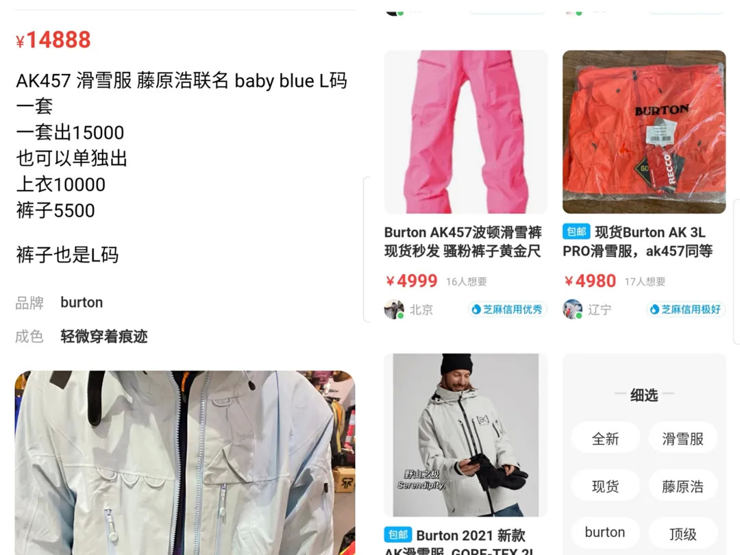 Burton有一款限量在日本发售的滑雪服AK457,价格大概在8000元左右,就是比利白的心头好。AK在单板雪服中有比较高的地位,很多圈里的大神都会买AK穿,去年一件原价3、4000元的粉色AK价格能被炒到过万。在闲鱼上,潮流大师藤原浩联名的一款蓝色AK滑雪服价格是15000元。
