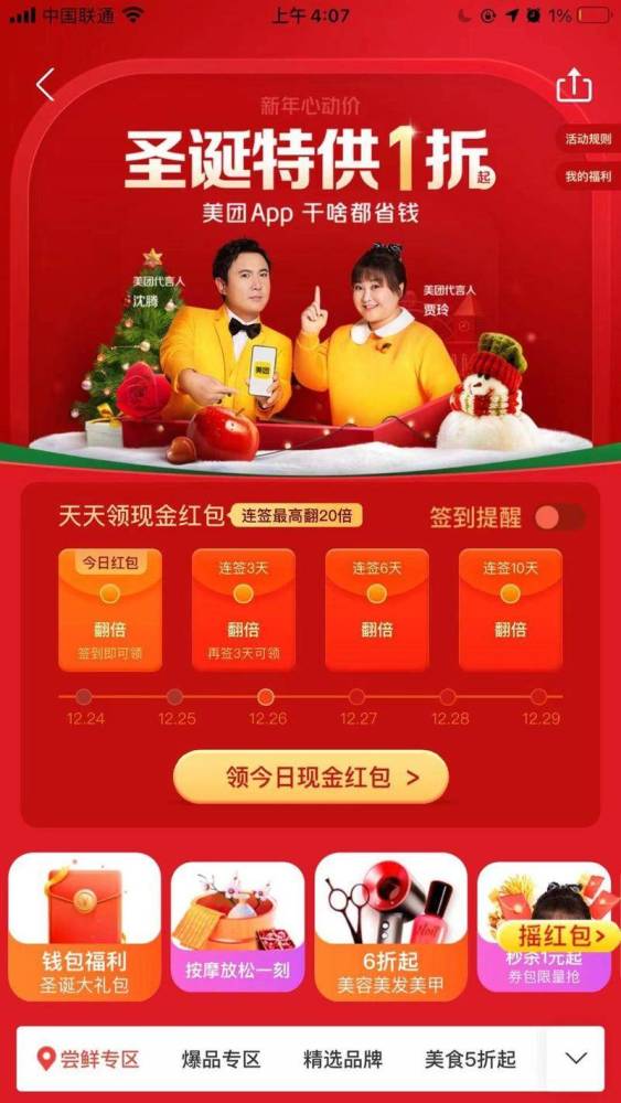 随着圣诞节和新年到来,美团APP的首页中央,早早上了全平台通用的活动——“新年心动价,领100元红包”。活动引导消费者在接下来的10天里,抽四次红包。