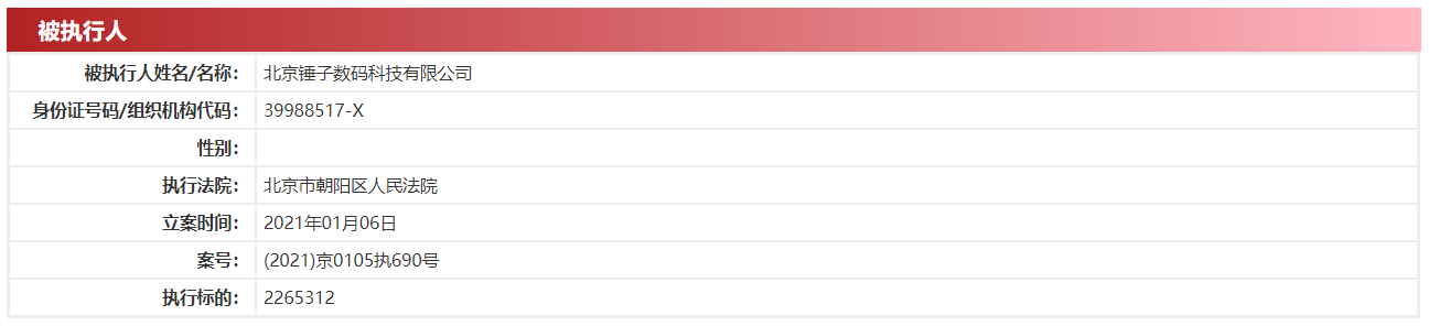 中国执行信息公开网显示,北京锤子数码科技有限公司1月6日被北京市朝阳区人民法院列为被执行人,案号为(2021)京0105执690号,执行标的为2265312元。据天眼查APP显示,北京锤子数码科技有限公司疑似实际控制人为罗永浩。