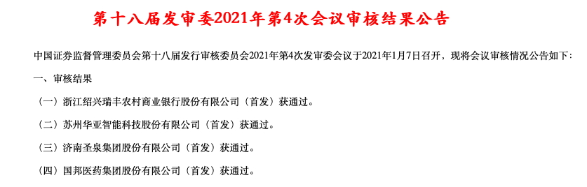 1月7日晚间,证监会网站消息,第18届发审委2021年第4次会议审核结果公告显示,浙江绍兴瑞丰农村商业银行(简称“瑞丰农商行”)首发获通过。