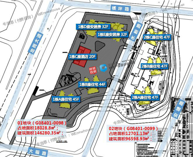 01地块:占地面积约1.8万平方米,建筑面积约14.6万平方米,主要包含2座住宅、1座酒店及办公混合建筑和2座安居房。