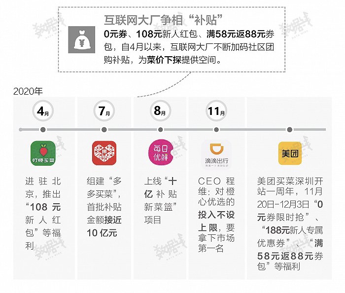 去年7月,美团正式成立社区团购部门,12月“美团优选”正式上线;在拼多多,社区团购成为高层强调的重点业务;6月上线“橙心优选”之后,滴滴在三个月内将业务拓展到四川、广西等7省市。