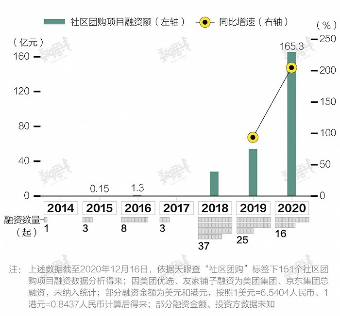 实际上,社区团购兴起于2016年,疫情加速了这一模式的发展。据界面新闻不完全统计,截至2020年12月,社区团购项目明确公开的融资金额已达到165.3亿元,比去年多出100多亿。2020年下半年开始,巨头的加码搅动了整个行业,阿里、腾讯、京东、滴滴、拼多多和美团悉数入场。
