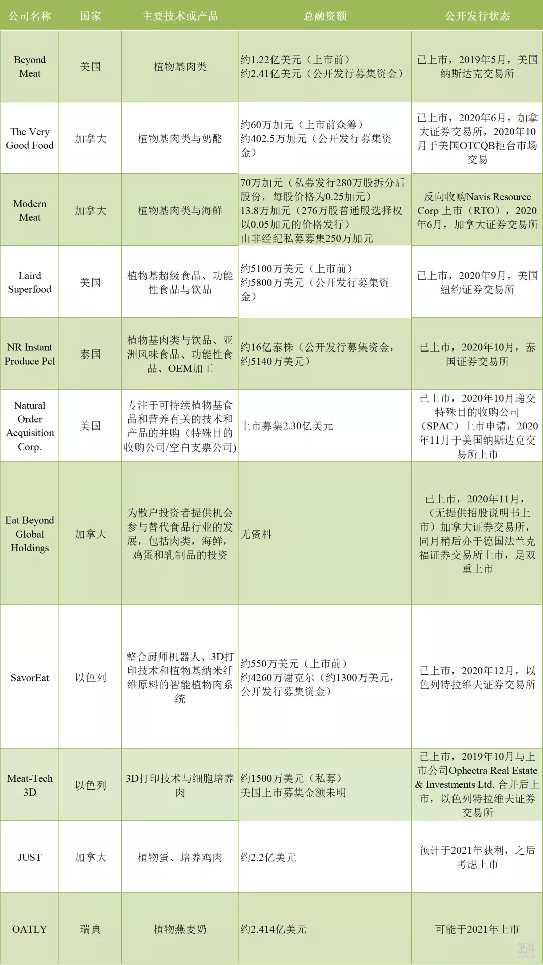 综观2019年Beyond Meat成功在美国上市后而始发的替代蛋白企业上市热潮,直到2020年12月,紧跟在人造肉第一股Beyond Meat之后,共有8家企业公开发行,其中3家在加拿大,2家在美国,2家在以色利,另有1家泰国;在这之中, 2家企业则通过并购成为上市公司(其中1 家先前已通过并购在母国以色列上市的企业刚向美国证监会递交上市申请),另2 家企业则藉当地交易机制得以快速上市。市场上见风声或有上市计划的则另有2家企业。