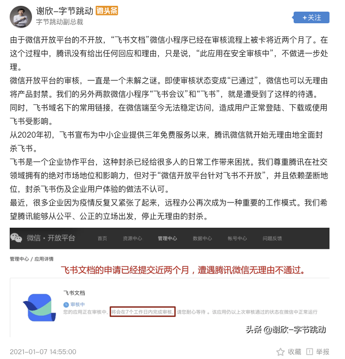 1月7日下午,字节跳动副总裁谢欣在其头条号发文称,由于微信开放平台的不开放,“飞书文档”微信小程序已经在审核流程上被卡将近两个月了。在这个过程中,腾讯没有给出任何回应和理由,只是说,“此应用在安全审核中”,不做进一步处理。