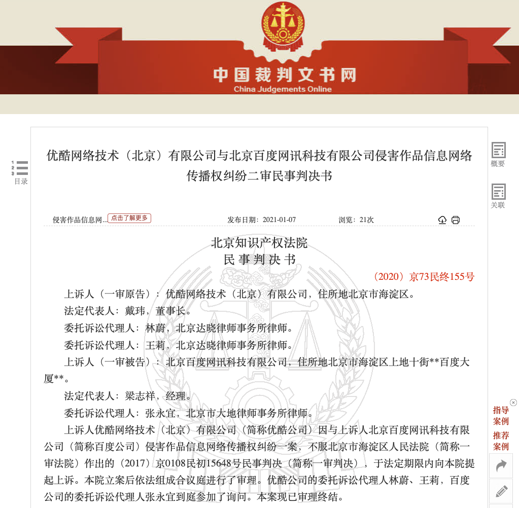 据天眼查APP显示,1月6日,优酷网络技术(北京)有限公司与北京百度网讯科技有限公司侵害作品信息网络传播权纠纷二审民事判决书公布,案号为(2020)京73民终155号,上诉人(一审原告)为优酷网络技术(北京)有限公司,上诉人(一审被告)为北京百度网讯科技有限公司。