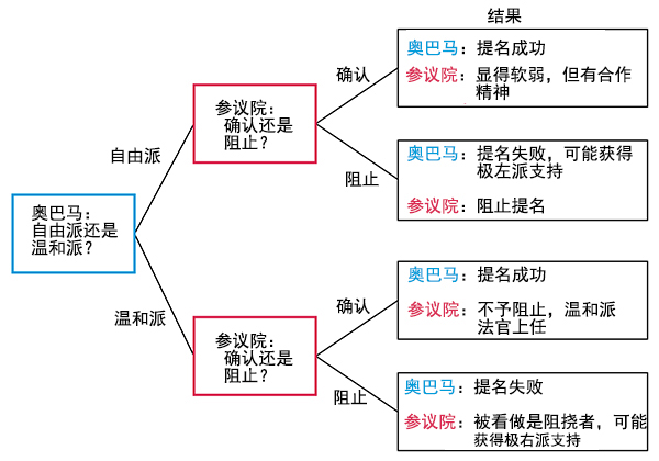 如果奥巴马采取折中路线,提名一位温和派人士,相当于在保留50美元的同时分出50美元。共和党人可能会接受这样的提议。但另一方面,共和党也有可能将温和派提名看成是不及“三七开”的交易,即获益低于30%;这样的话他们仍有可能拒绝奥巴马。