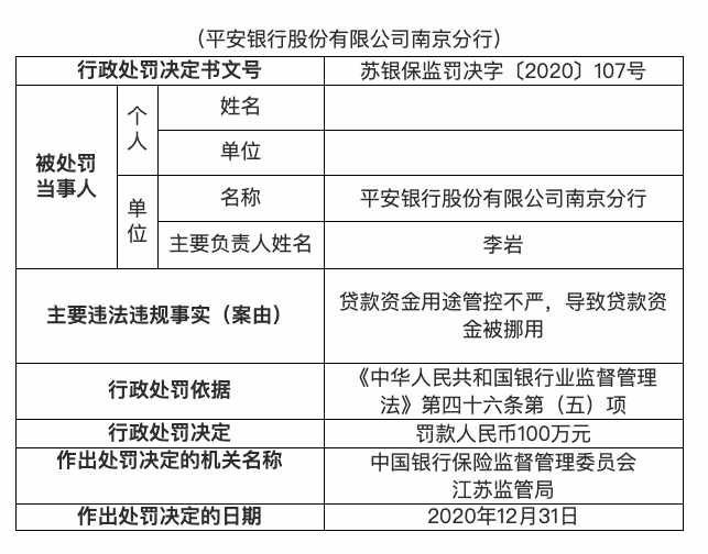 1月7日,江苏银保监局发布的行政处罚信息公开表显示,平安银行股份有限公司南京分行因贷款资金用途管控不严、导致贷款资金被挪用,被处罚款人民币100万元。陆斌负管理责任、陈思思负经办责任,均受到警告并处罚款人民币5万元。