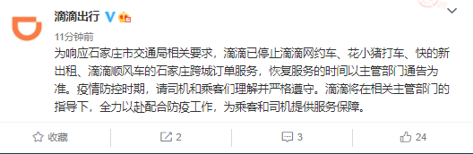 1月7日,@滴滴出行 微博表示,为响应石家庄市交通局相关要求,滴滴已停止滴滴网约车、花小猪打车、快的新出租、滴滴顺风车的石家庄跨城订单服务,恢复服务的时间以主管部门通告为准。疫情防控时期,请司机和乘客们理解并严格遵守。滴滴将在相关主管部门的指导下,全力以赴配合防疫工作,为乘客和司机提供服务保障。