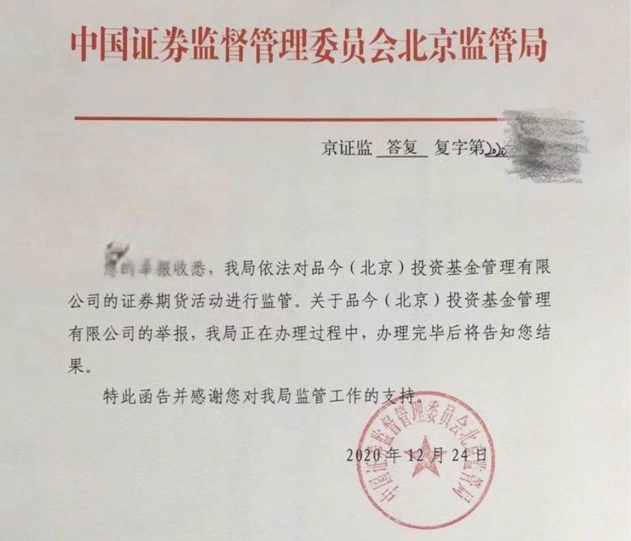 有投资者接到北京市证监局回函。回函显示,正在办理相关举报,办理完毕后将告知结果。