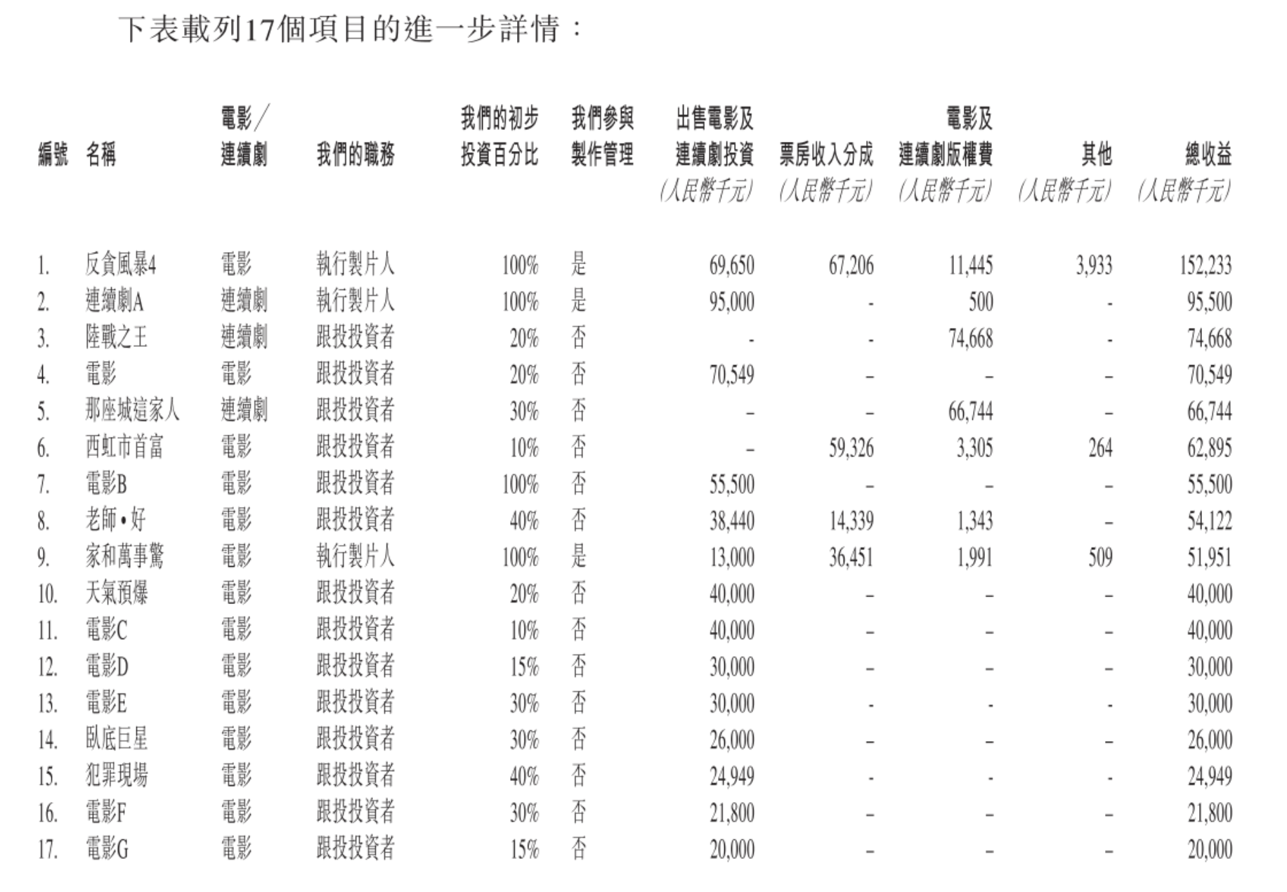 据招股书,耳东影业作为跟投投资者等参与影视投资。耳东影业披露的17个获得2000万元以上收益的项目中,知名的作品包括《反贪风暴4》和《西虹市首富》等,职务多为跟投投资者。古天乐关联的天下一公司被认为是耳东影业在2016年和2017年的最大供应商。
