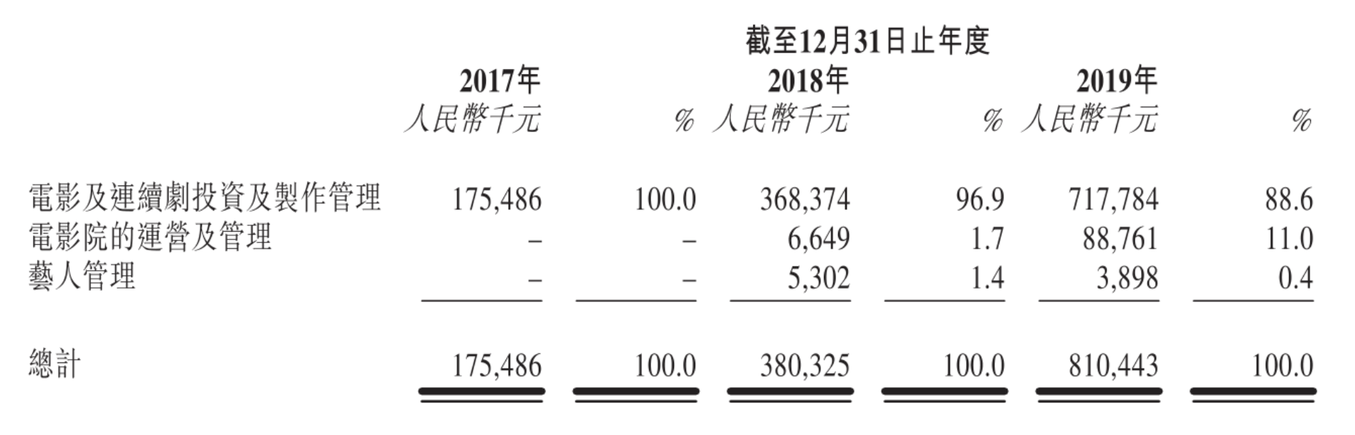 投资影视为耳东影业带来收益。IPO招股书披露,耳东影业核心业务包括电影及连续剧投资制作管理,并在2018年涉足影院运营及管理和艺人管理。电影及连续剧投资制作管理贡献大部分收益,该业务在2017年、2018年及2019年的营收分别为1.75亿元、3.68亿元和7.18亿元。耳东的影视剧投资和管理收入由三部分构成,包括出售电影投资、票房分成收益以及影视剧版权收益,出售投资占比最高。