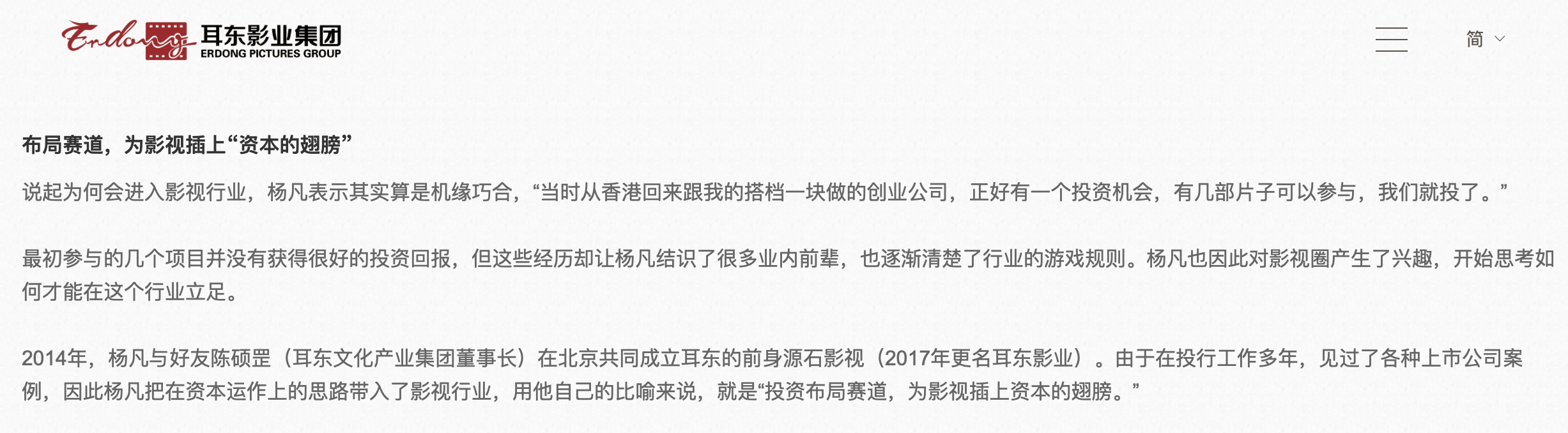在耳东影业官网的一篇专访《一年生,两年长,三年爆:90%的爆款电影背后都有它》中提到,2014年,杨凡与好友陈硕罡(耳东文化产业集团董事长)在北京共同成立耳东的前身源石影视。由于在投行工作多年,见过了各种上市公司案例,因此杨凡把在资本运作上的思路带入了影视行业。