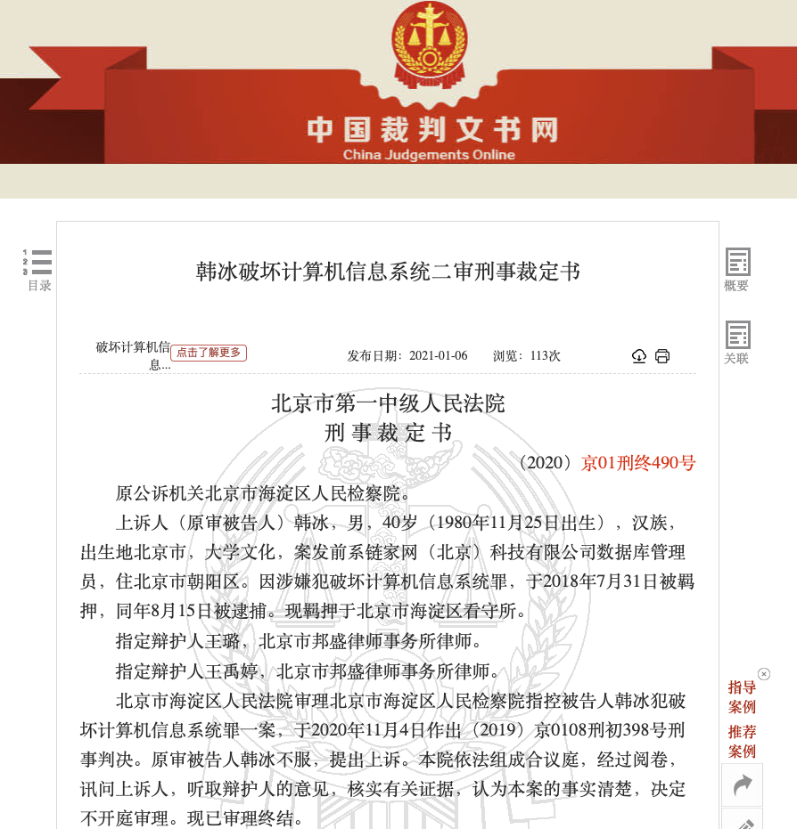 中国裁判文书网1月7日消息,北京市第一中级人民法院日前发布韩冰破坏计算机信息系统二审刑事裁定书。北京一中院认为,一审法院根据韩冰犯罪的事实、犯罪的性质、情节及对于社会的危害程度所作出的判决,事实清楚,证据确实、充分,定罪及适用法律正确,量刑适当,审判程序合法,应予维持。北京一中院裁定:驳回上诉,维持原判。