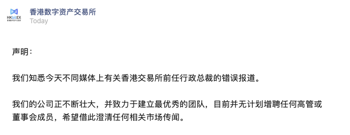 1月7日晚,香港数字资产交易所在其官方微信公众号发布声明称,我们知悉今天不同媒体上有关香港交易所前任行政总裁的错误报道。 我们的公司正不断壮大,并致力于建立最优秀的团队,目前并无计划增聘任何高管或董事会成员,希望借此澄清任何相关市场传闻。
