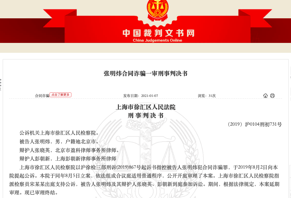 最终,法院一审判决张明炜因合同诈骗罪,判处有期徒刑十一年,剥夺政治权利三年,并处罚金人民币二十万元。