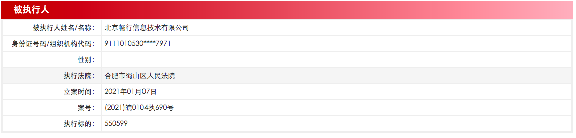 据中国执行信息公开网显示,1月7日,北京畅行信息技术有限公司(嘀嗒出行)新增1条被执行人信息,执行法院为合肥市蜀山区人民法院,案号为(2021)皖0104执690号,执行标的超55万元。