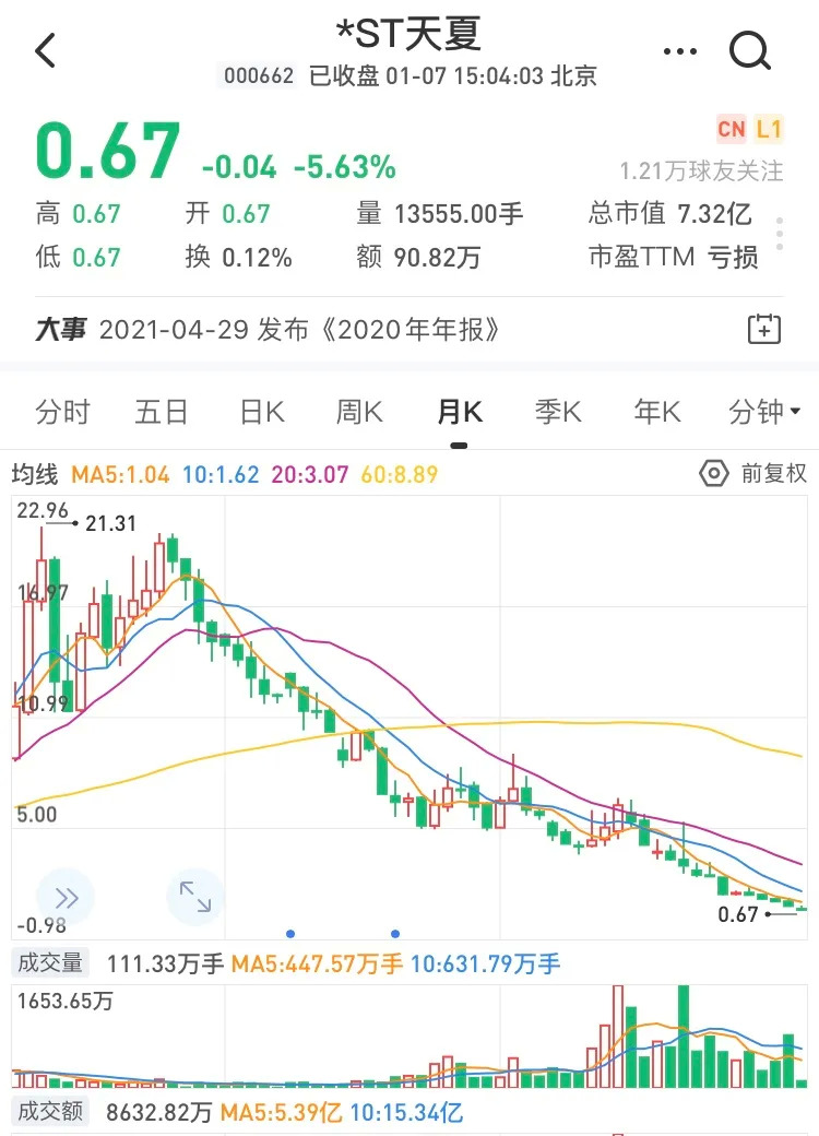 1月6日,*ST天夏(“天夏智慧城市科技股份有限公司”的股票简称)股票开盘即跌停,报0.71元。今日,*ST天夏股价再创历史新低,收盘价位0.67,跌幅为5.63%。至此,*ST天夏已经连续16个交易日(2020年12月16日—2021年1月7日)收盘价低于股票面值(即1元),即便股价在此后4个交易日天天涨停,也将无法回升至1元之上。