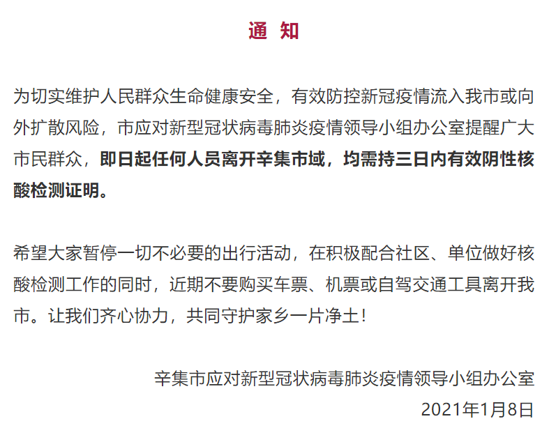据“辛集发布”微信公众消息,为切实维护人民群众生命健康安全,有效防控新冠疫情流入我市或向外扩散风险,市应对新型冠状病毒肺炎疫情领导小组办公室提醒广大市民群众,即日起任何人员离开辛集市域,均需持三日内有效阴性核酸检测证明。