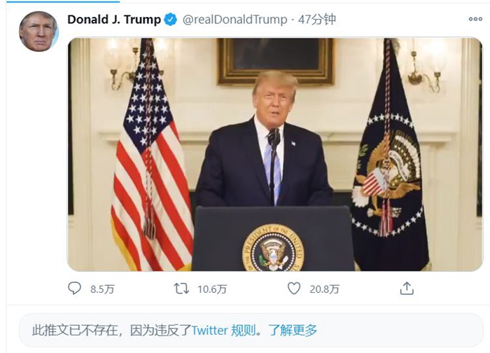 国会大厦遇袭后数小时,特朗普曾在Twitter发布视频声明。在声明里,他没有谴责袭击者,仅呼吁大家撤离:“回家吧,我们爱你们,你们很特别。”Twitter已将该视频删除。