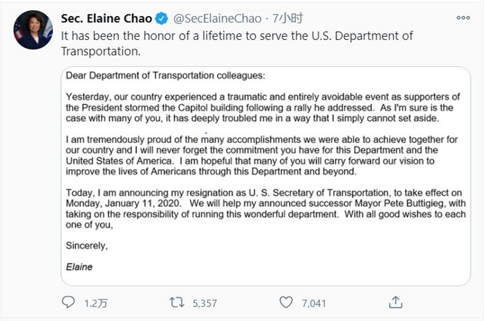 在辞职声明中,赵小兰把国会骚乱称为“完全可以避免”的事件,“我深受困扰,无法坐视不理。”