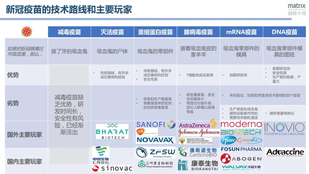 今天这篇文章主要分析了新冠疫苗研发进展如何?分为哪几个技术路线?有哪些主要玩家?到底哪种疫苗最好?新冠疫苗的保护时长有多久?新冠病毒出现变异,疫苗还有效吗?我们离全球重启还有多远?以及新冠疫苗对资本市场的短期和长期影响等大家关心的主要问题。本文始于经纬医疗团队薛明宇和耿然近期在经纬内部的一次分享。以下,Enjoy: