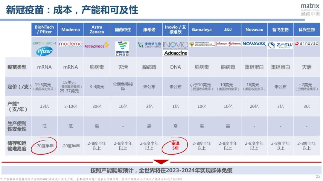 就目前的疫苗产能情况来看,约为113亿针/每年,如果每人打两针可以实现一年免疫。预计在发达国家及中国,只要产能足够,将通过自愿或强制免疫将在较短时间内实现群体免疫。按照产能爬坡预计,全世界将在2023-2024年实现群体免疫。
