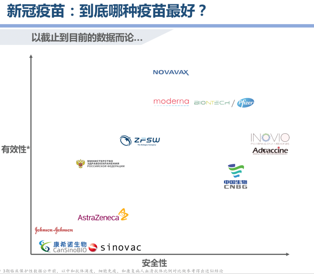 根据截至目前的数据,就有效性而言,美国临床阶段疫苗公司Novavax研发的候选新冠疫苗产生的中和抗体滴度最高,目前在III期临床,值得期待是否能进一步超越95%保护率的高线。目前公布保护率数据的疫苗来看,辉瑞/BioNTech和Moderna的疫苗都整体达到了95%左右的保护率,是非常优秀的结果。