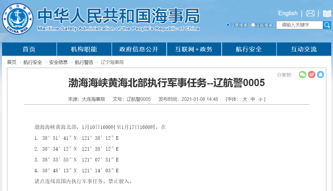 大连海事局发布航行警告:渤海海峡黄海北部,1月10日1600时至1月17日1600时,在