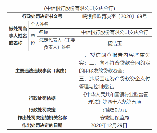 1月8日消息,据中国银保监会安徽监管局行政处罚信息公开表(皖银保监罚决字〔2020〕68号),中信银行股份有限公司安庆分行存在以下主要违法违规事实:一、授信调查报告内容严重失实;二、向不符合贷款合同约定的用途发放贷款资金;三、违反固定资产贷款资金支付管理与控制规定。安徽银保监局决定对其处以罚款50万元。