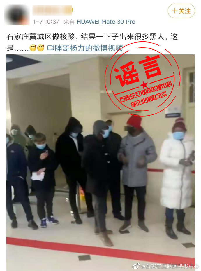 据@石家庄互联网举报中心 消息,近日,微信、微博等平台流传 “藁城区有外国人聚集做核酸检测”的视频、图片信息。经石家庄互联网举报中心向藁城区相关部门核实,事发地不在藁城,藁城区也无涉外高校。经向石家庄铁道大学了解,网传信息为1月6日该校按全市防疫工作要求组织外国留学生进行核酸检测的场景。