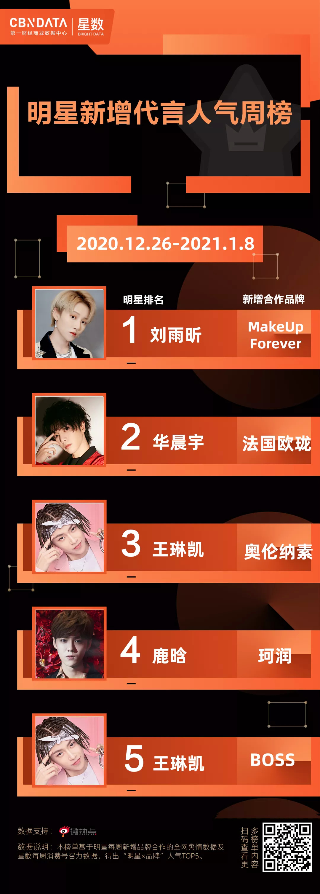 CBNData星数全新发布“明星新增代言人气周榜”及“明星代言周报”,聚焦美妆个护、食品饮料、家电3C、服饰鞋包、日化家清五大品类。