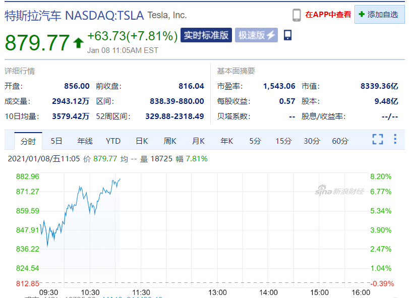 1月8日晚间消息,特斯拉超越Facebook成为美国第五大上市公司。截至目前,特斯拉股价上涨约8%,市值突破8000亿美元,而Facebook股价则下跌,市值目前约为7550亿美元。截至目前,特斯拉市值仅次于苹果、微软、亚马逊和谷歌母公司Alphabet。