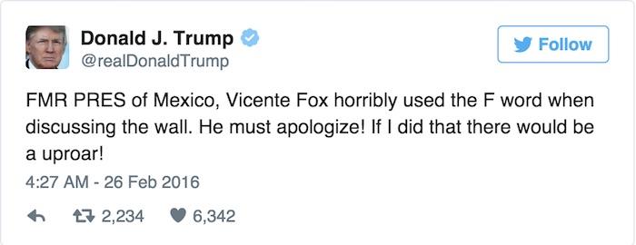 特朗普更关心的似乎不是墨西哥到底出不出钱,而是态度问题。他没有对卡尔德隆进行反击,但在26日发表的推文要求福克斯为说脏话道歉。“墨西哥前总统,维森特·福克斯在讨论这堵墙的时候用了F打头的这个词。他必须道歉!要是说这话的是我,一场骚乱是必然的了!”