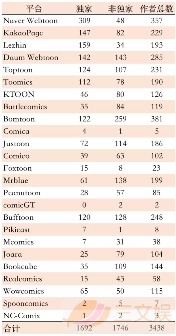 2019年,韩国漫画平台的独家签约作者共计1692人,其中Naver Webtoon的独家签约作者人数最多为309人,随后是LEZHIN(159人),KakaoPage(147人),Daum Webtoon(142人),Toptoon(124人),Bomtoon(122人)。