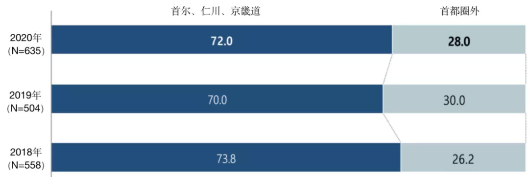 从业者的地域分布则显示多数作者都选择居住在首都圈(首尔、仁川、京畿道),占比达到了72%。从性别上来看,75.5%的男性作者更愿意选择居住在首都圈。这是因为如Naver Webtoon、KakaoPage等漫画平台的总部大多都设在首尔,而京畿道又是国家级漫画孵化基地。要想与编辑或平台获取更方便的沟通,首都圈就成了网漫作者居住的首选地带。