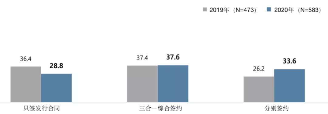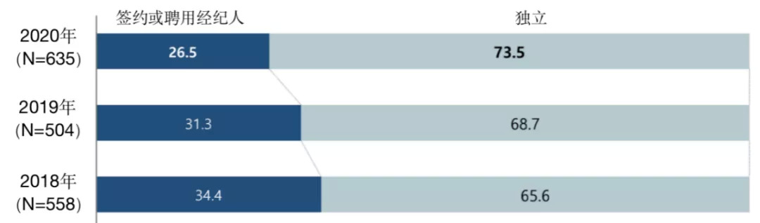 但并没有很多创作者与工作室签约或聘用经纪人,甚至体现出逐年递减的趋势。签约或聘有经纪人的作者从2018年的34.4%的占比逐年减少,到了2019年为31.3%,2020年则降至26.5%,越来越多的人选择独立。