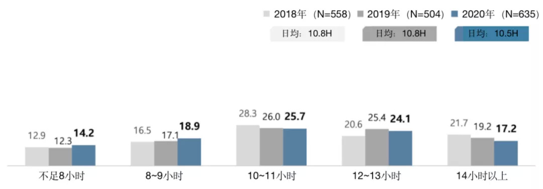 工作时长方面,2020年网漫作者的日均工作时长为10.5小时,但工作时长超过10小时的比重仍占多数达到了67%。从工种来看,主要负责作画的作者工作时间最长,平均达到了11.2小时,其次是兼顾剧情和作画的作者日均工作10.9小时。只负责剧情的作者日均工作时长为8小时。